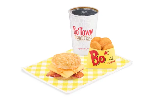 Smoky bacon strips combined with American cheese, fresh eggs, and a made-from-scratch buttermilk biscuit. This package contains 730-1030 calories and is perfect for those who prefer a low-calorie breakfast. You can choose between a medium Pepsi drink, coffee, or a Bo-Tato Rounds® as a drink with this breakfast menu.