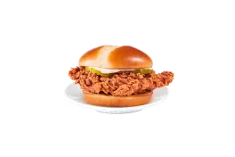 This delicious chicken sandwich features a juicy, tender chicken breast marinated in a secret blend of spices and sauce. It’s coated in a crispy, hand-breaded buttermilk crust that adds the perfect crunch. Two thick slices of pickle and a layer of creamy mayonnaise boost the flavor even more.