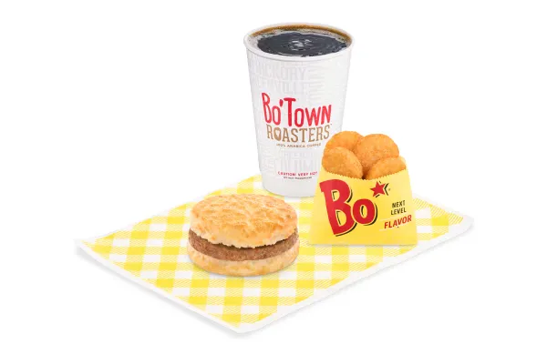 A combination of Southern breakfast sausage, in-restaurant prepared buttermilk biscuit, and fresh eggs. Served with drinks of your choice, either a Bo-Tato Rounds®, coffee, or medium drink.