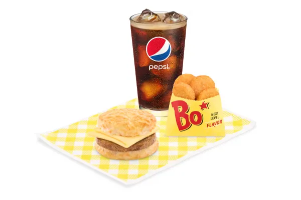 Choose a drink between a medium Pepsi, Bo-Tato Rounds®, or a yummy and hot morning brew. The sandwich is a combo of eggs, a buttermilk biscuit, and all the famous American cheese.